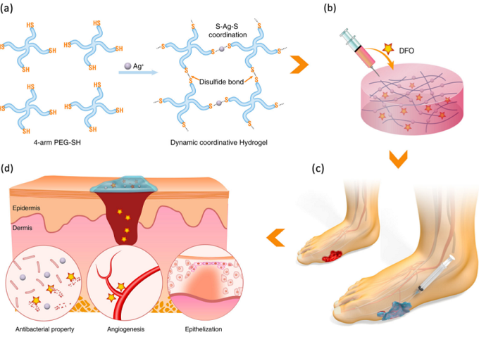 在這篇文章中報(bào)告了一種可注射的,自愈合水凝膠,具有抗菌和血管生成特性,用于糖尿病傷口再生。利用多臂巰基聚乙二醇(SH-PEG)與硝酸銀(AgNO3)協(xié)同交聯(lián)制備水凝膠(稱為Ag-SH-PEG)(方案1a)。由于銀-硫配位鍵的動(dòng)態(tài)和可逆性質(zhì),合成的配位水凝膠具有反復(fù)破裂后的自愈特性和通過醫(yī)用針頭應(yīng)用時(shí)的可注射特性。這種自愈和可注射的特性有利于皮膚傷口的修復(fù),因?yàn)樗鼈冇兄跍p少凝膠碎片,并在靶部位整合破裂的凝膠,這樣即使在外部機(jī)械破壞之后,也能持續(xù)的支持皮膚傷口的愈合。此外,水凝膠網(wǎng)絡(luò)逐漸釋放抗菌銀離子,這對(duì)于開放性糖尿病皮膚傷口是非常有利的。由于血管生成藥物去鐵氧胺(DFO)與配位水凝膠的結(jié)合,他們最終獲得了一種易于管理、抗外力、抗菌和血管生成的多功能水凝膠(方案1b)。例如,足部潰瘍導(dǎo)致的不規(guī)則傷口;在這種情況下,血管通常難以生長(zhǎng)(方案1c),這可以在其提議的配方中克服。此外,目前還沒有自愈水凝膠被報(bào)道包含促進(jìn)血管生成同時(shí)防止細(xì)菌感染的內(nèi)在結(jié)構(gòu)特性。他們預(yù)計(jì)這種獨(dú)特的多功能水凝膠將表現(xiàn)出有效的抗感染能力,增強(qiáng)血管生成活性,并隨后加速糖尿病皮膚傷口部位的組織愈合(方案1d)。