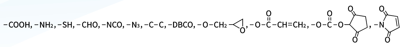 賽諾邦格提供的聚乙二醇衍生物平臺包括但不限于線性PEG以及一系列特殊結(jié)構(gòu):兩臂、四臂、六臂、八臂、V型、Y型、O型、超支化、梳狀、樹枝狀PEG衍生物。公司提供的聚乙二醇衍生物純度高且取代基團(tuán)豐富,包括并不限于以下基團(tuán):