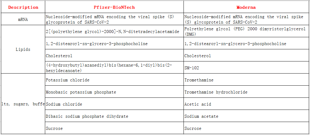目前我國境內使用的是滅活疫苗,世界范圍內使用范圍最廣的是輝瑞/BioNTech新冠疫苗。年初,輝瑞疫苗與Moderna疫苗的成分大公開,整理如下(輔料主要包括mPEG-DMG、ALC-0159、ALC-0315、DMG-PEG2000、SM-102、DSPC等):